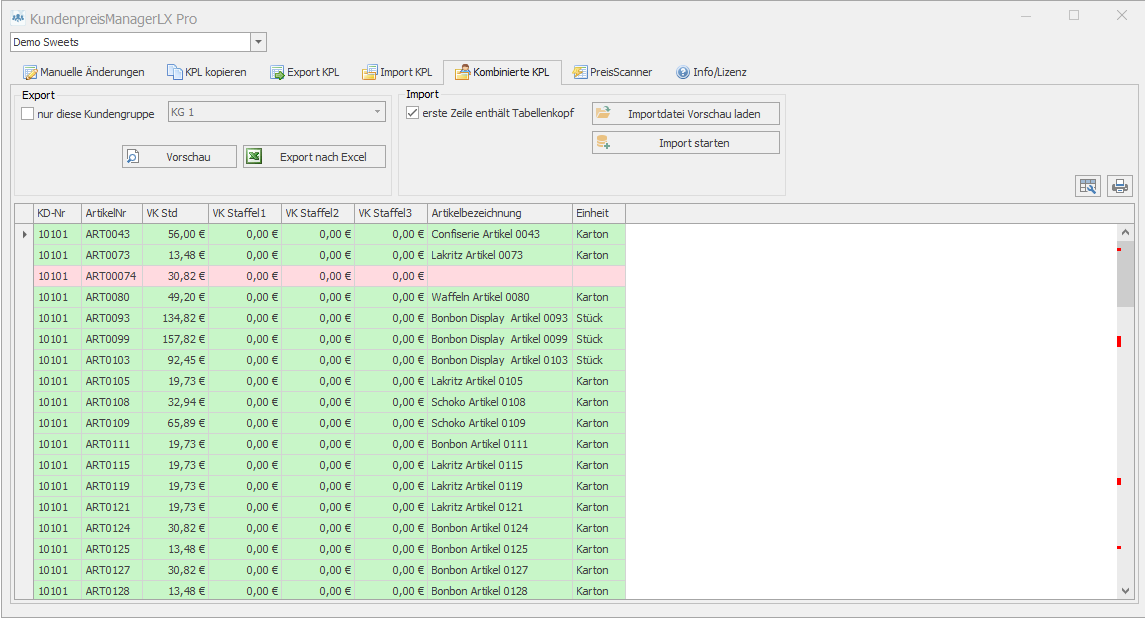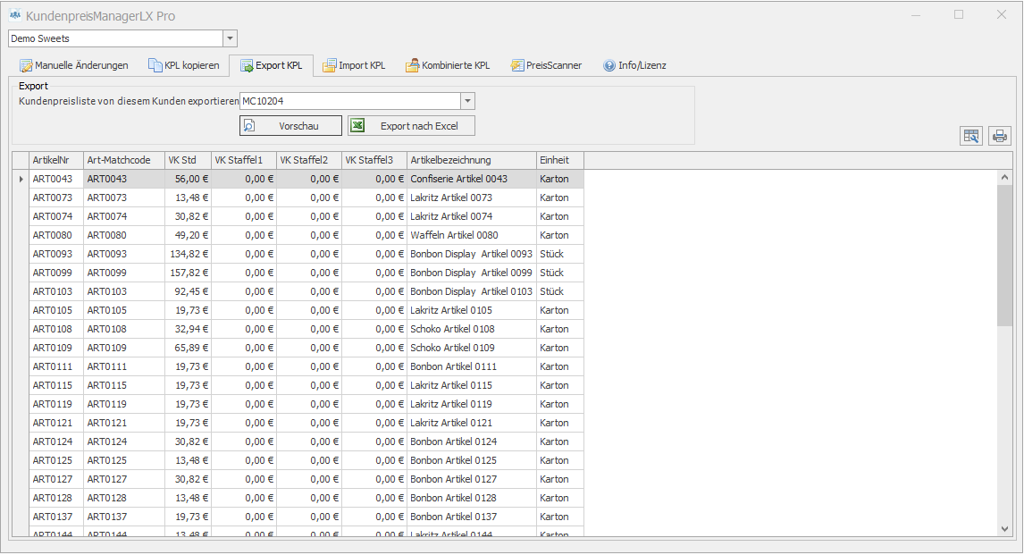 Zusätzlich kann das Programm auch eine kombinierte Kundenpreisliste exportieren. Darauf sind alle kundenspezifischen Preise aller Kunden mit der Zuordnung zum Kunden enthalten.