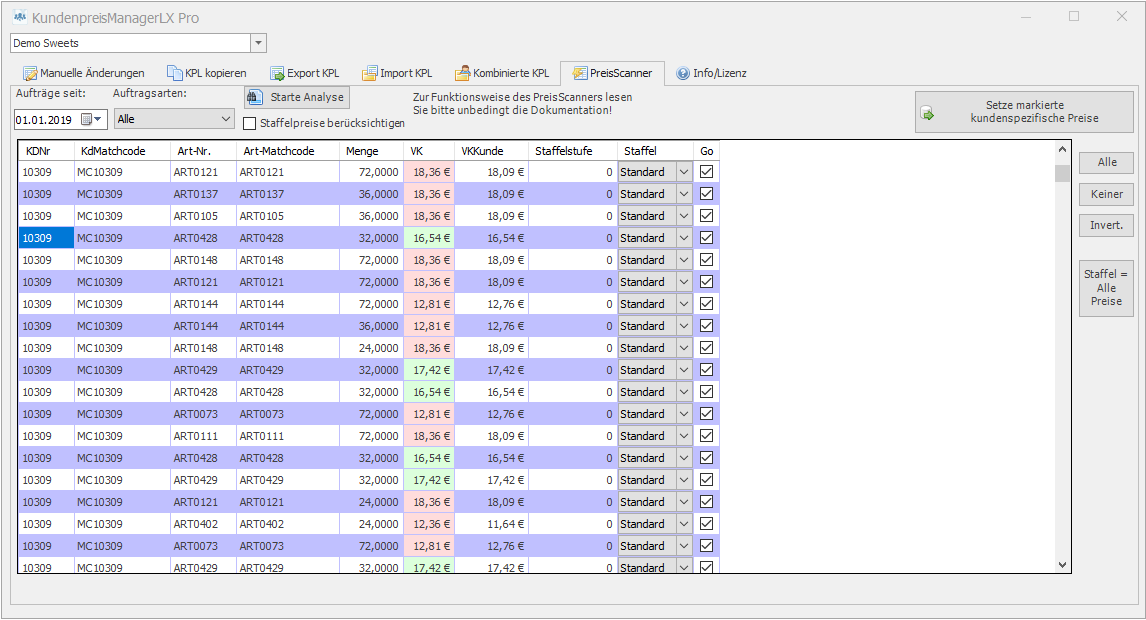 Es lassen sich bereits erstellte Aufträge nach manuell angepassten Preisen durchsuchen und diese Preise automatisch als kundenspezifische Preise hinterlegen (Preisscanner). Dabei ist vor dem Anlegen bzw. Anpassen der Preise eine Übersicht mit Auswahlmöglichkeit vorhanden.