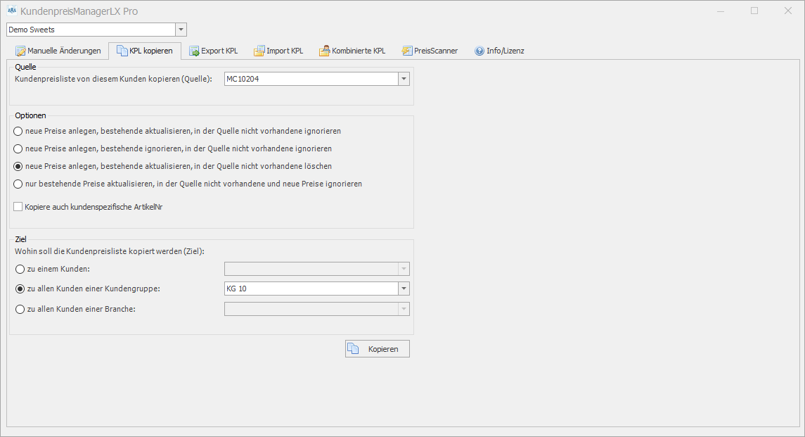 Sowohl beim Import und auch beim Kopieren können Sie als Ziel auch eine gesamte Kundengruppe bzw. eine Branche angeben. Die kundenspezifischen Preise werden dann zu jedem Kunden in dieser Kundengruppe bzw. Branche kopiert.