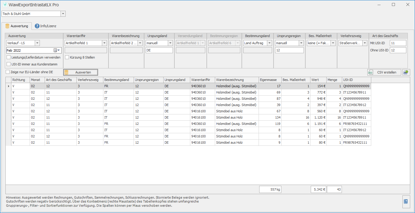 WawiExportIntrastatLX Pro ist ein Programm um die benötigten Informationen für Intrastat-Meldungen anzeigen und exportieren zu können. Die Auswertung erfolgt aus Monatsbasis auf Grund der erstellten Belege der Warenwirtschaft.