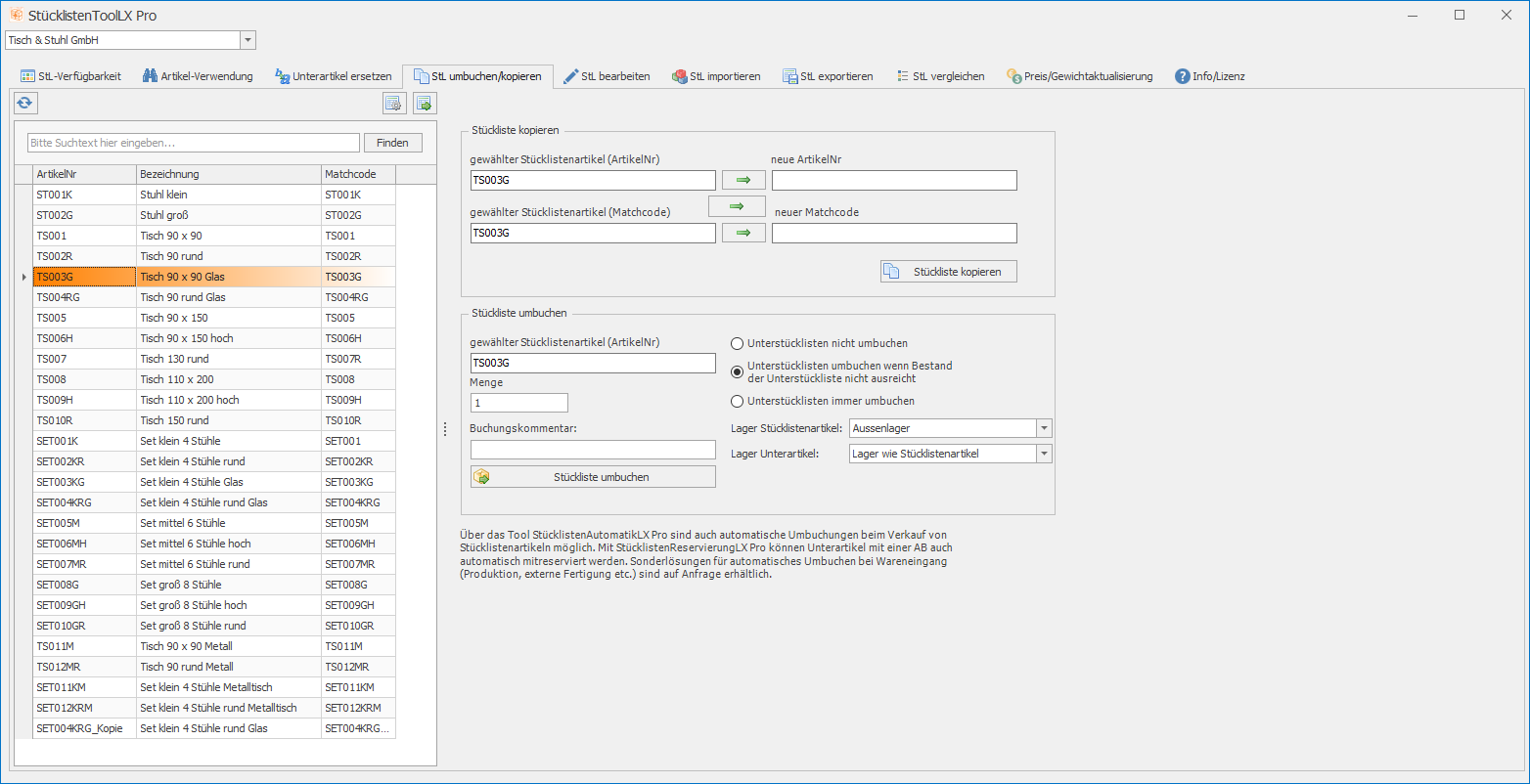- Umbuchung von Stücklistenartikeln, auf Wunsch auch mit Unterstücklisten und auf Wunsch auch bestandsabhängig (nur Unterstücklisten umbuchen, wenn Bestand nicht ausreichend ist)