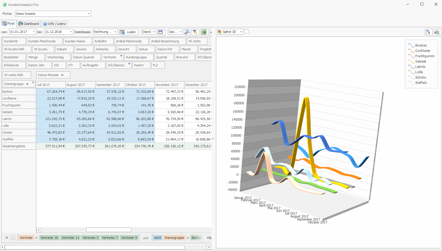 Mit KundenumsatzLX Pro erstellen Sie einfache oder auch komplexe Pivot-Auswertungen. Damit sind auch komplexe Auswertungen auf Artikel-, Kunden-, Warengruppen- und Zeitebene ermöglich. Die Möglichkeiten sind nahezu unbegrenzt. Zeitgleich können die Daten auch grafisch dargestellt werden. Zusätzlich gibt es eine Drill-Down-Funktion, mit der sich die Daten, die sich hinter den einzelnen Werten verbergen, anzeigen lassen.