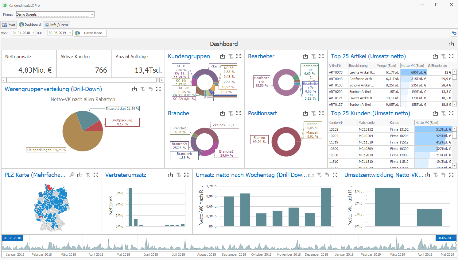 Mit dem komplexen Dashboard bekommen Sie einen schnellen Überblick über wichtige Umsatzzahlen. Die meisten Anzeigen verfügen gleichzeitig über Filter- und/oder Drill-Down-Funktionen. So können Sie in der grafischen Übersicht auch sehr schnell detaillierte Informationen erhalten.