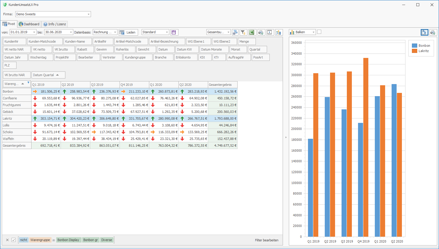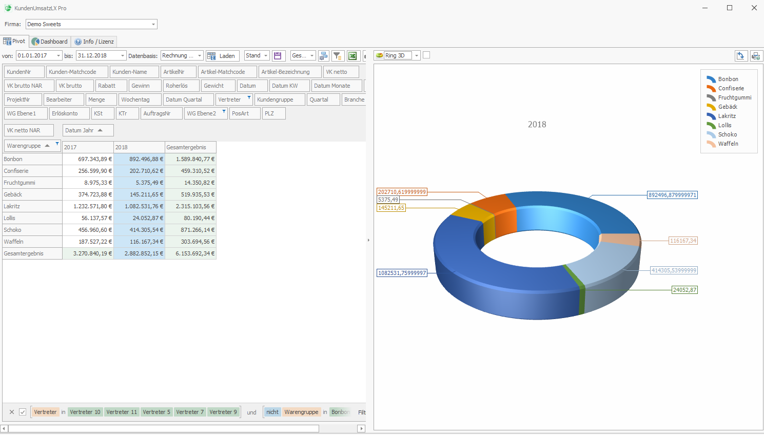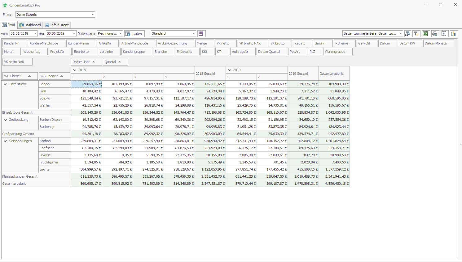 Mit KundenumsatzLX Pro erstellen Sie einfache oder auch komplexe Pivot-Auswertungen. Damit sind auch komplexe Auswertungen auf Artikel-, Kunden-, Warengruppen- und Zeitebene ermöglich. Die Möglichkeiten sind nahezu unbegrenzt. Zeitgleich können die Daten auch grafisch dargestellt werden. Zusätzlich gibt es eine Drill-Down-Funktion, mit der sich die Daten, die sich hinter den einzelnen Werten verbergen, anzeigen lassen.