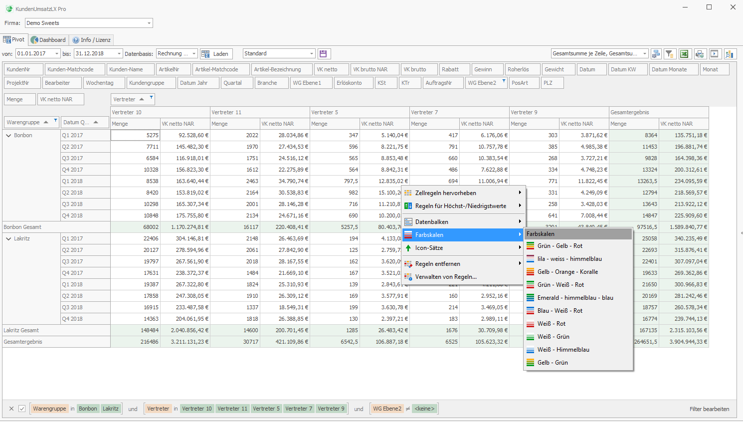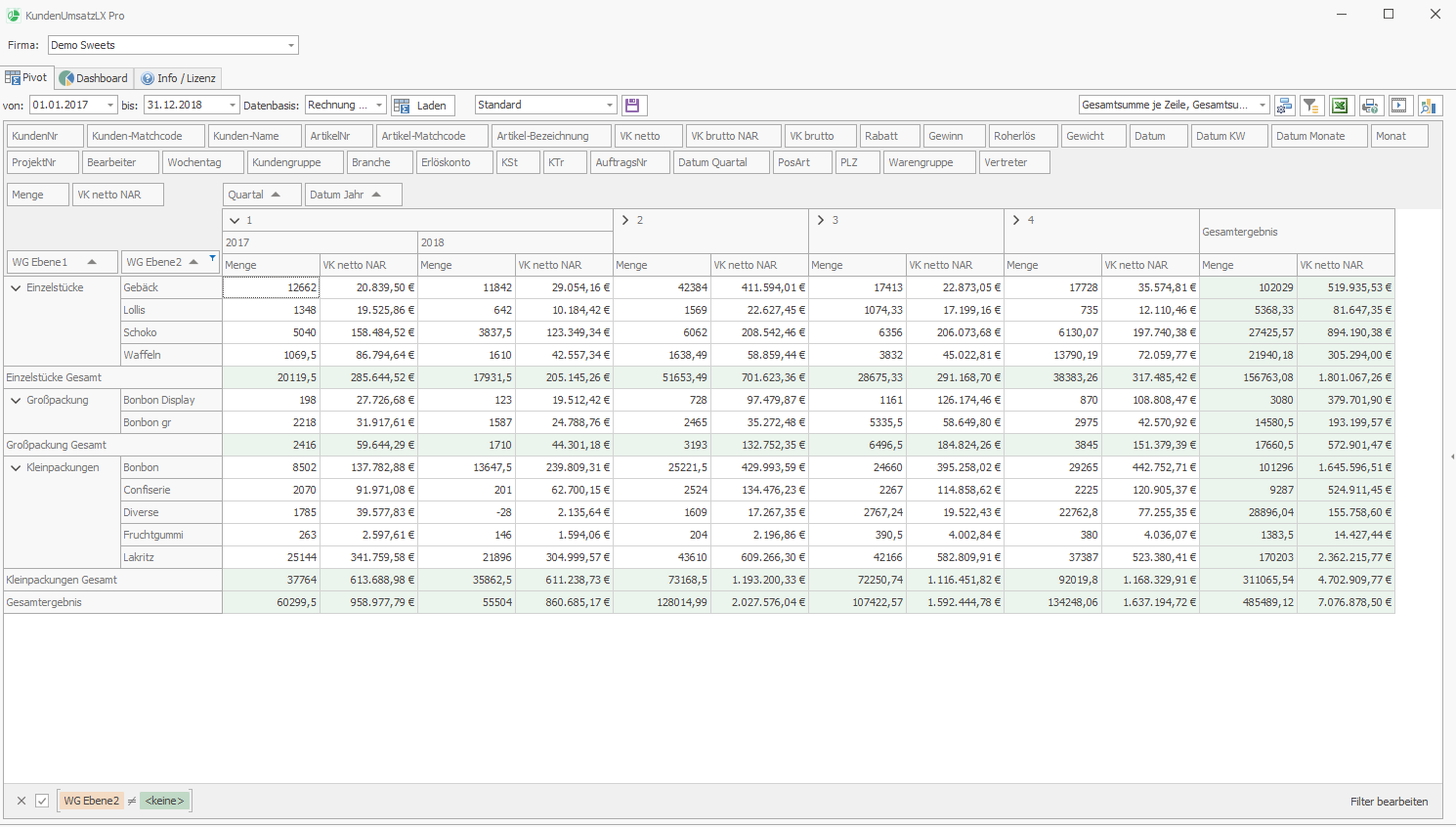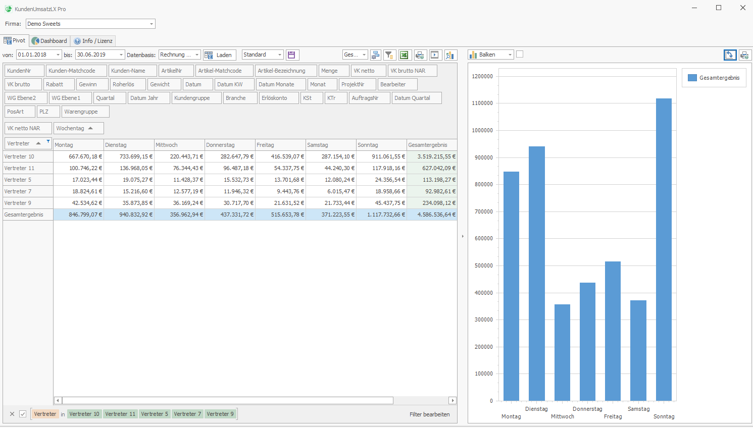 Mit KundenumsatzLX Pro erstellen Sie einfache oder auch komplexe Pivot-Auswertungen. Damit sind auch komplexe Auswertungen auf Artikel-, Kunden-, Warengruppen- und Zeitebene ermöglich. Die Möglichkeiten sind nahezu unbegrenzt. Zeitgleich können die Daten auch grafisch dargestellt werden. Zusätzlich gibt es eine Drill-Down-Funktion, mit der sich die Daten, die sich hinter den einzelnen Werten verbergen, anzeigen lassen.