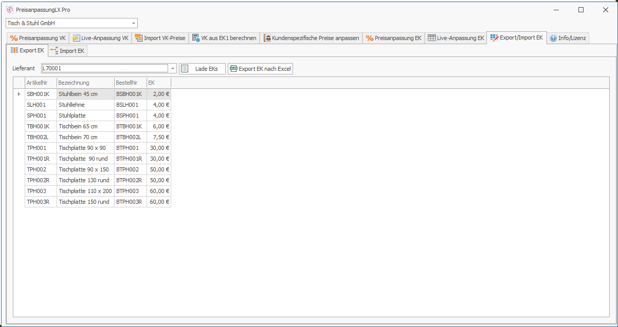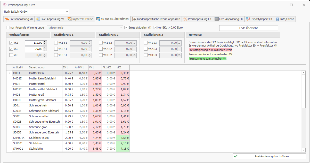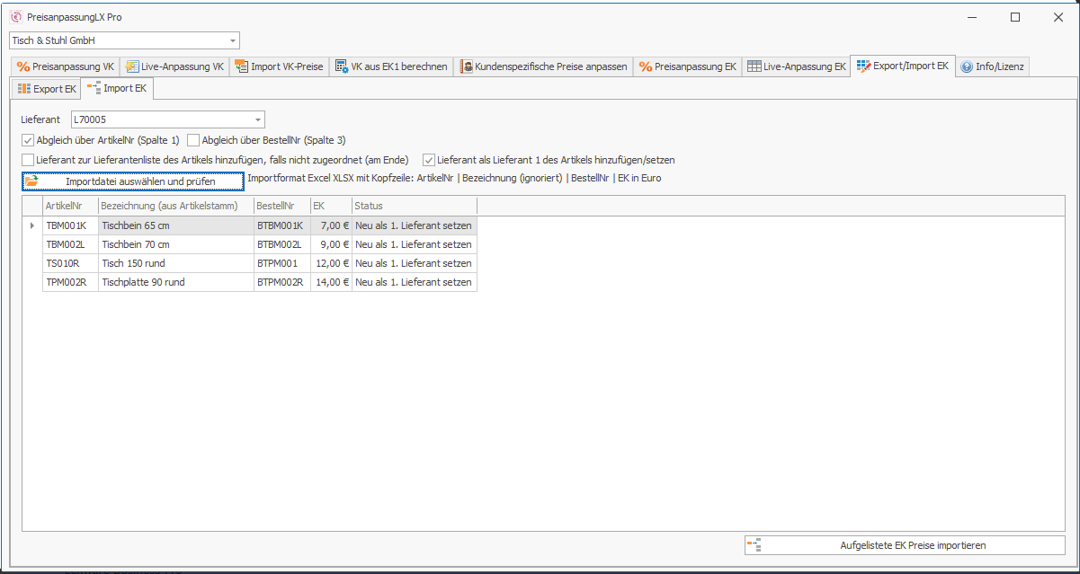 Neu ab Version 22.x ist der Export/Import von Einkaufspreisen nach/von Excel, sowie die Berechnung von VK Preisen (Preisgruppe 1 bis 3 mit jeweils bis zu 3 Staffelpreisen) anhand des aktuellen EK1.