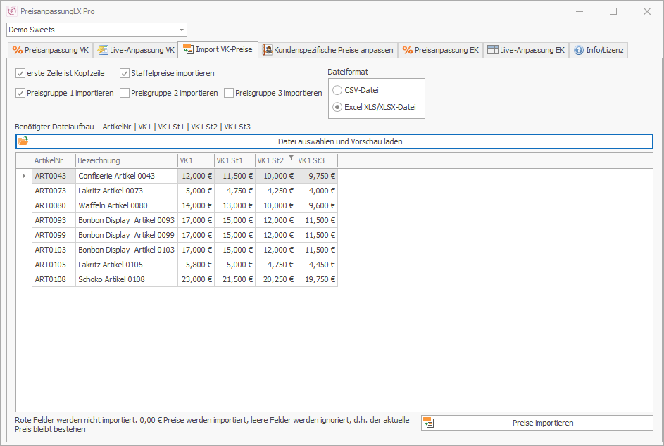 Eine flexible Importfunktion für Verkaufspreise (alle Preisgruppen inkl. Staffeln möglich) aus Excel oder CSV Dateien ermöglicht schnelle und vorbereitete Preisänderungen.