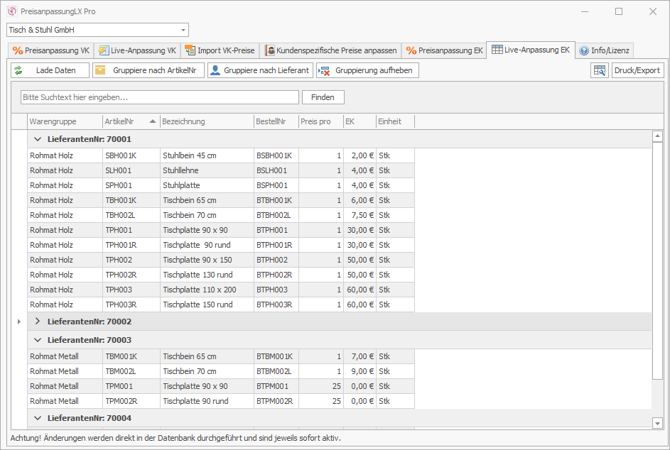 Es gibt eine Live-Bearbeitung von Preisen direkt in der Artikeltabelle, sowohl für Einkaufs- wie auch Verkaufspreis. Damit sind manuelle Änderung in einem Bruchteil der Zeit erledigt.