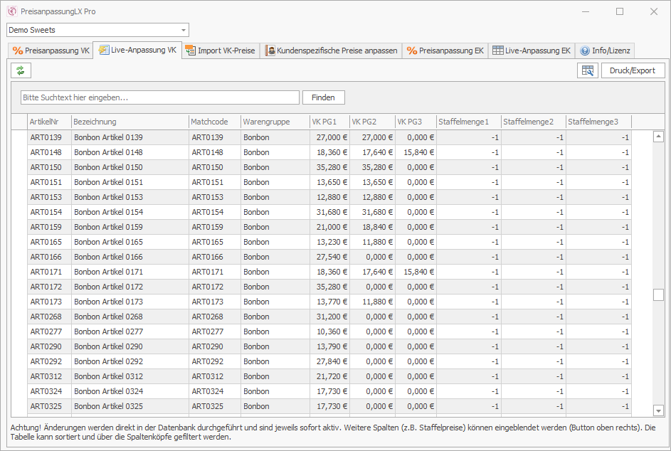 Sie können PreisanpassungLX Pro völlig unverbindlich und kostenfrei für 30 Tage testen. Die Demo-Version kann die Preisanpassung NICHT durchführen. Bei den Standardpreisen wird Ihnen das Programm anzeigen, wie viele Artikel betroffen sind und bei den kundenspezifischen Preisen erhalten Sie eine komplette Vorschau über die Änderungen.