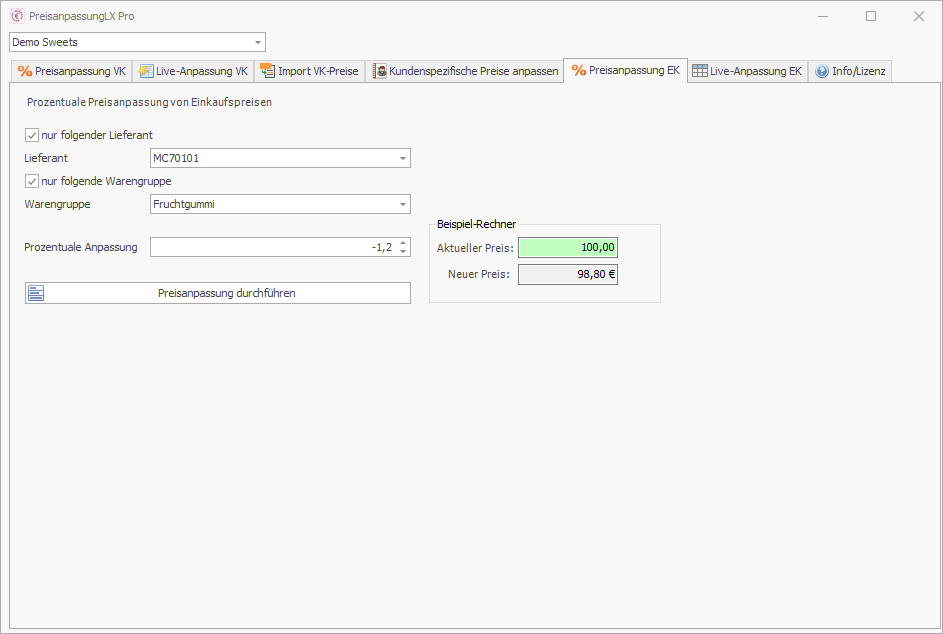 Mit dem Programm PreisanpassungLX Pro können Sie komfortabel Preisanpassungen in der Lexware Warenwirtschaft Pro und Premium durchführen. Die Preisanpassungen sind dabei jeweils prozentual möglich. Es können sowohl die Standardpreise, die Staffelpreise und auch die Preisgruppen jeweils individuell oder auch gemeinsam angepasst werden.